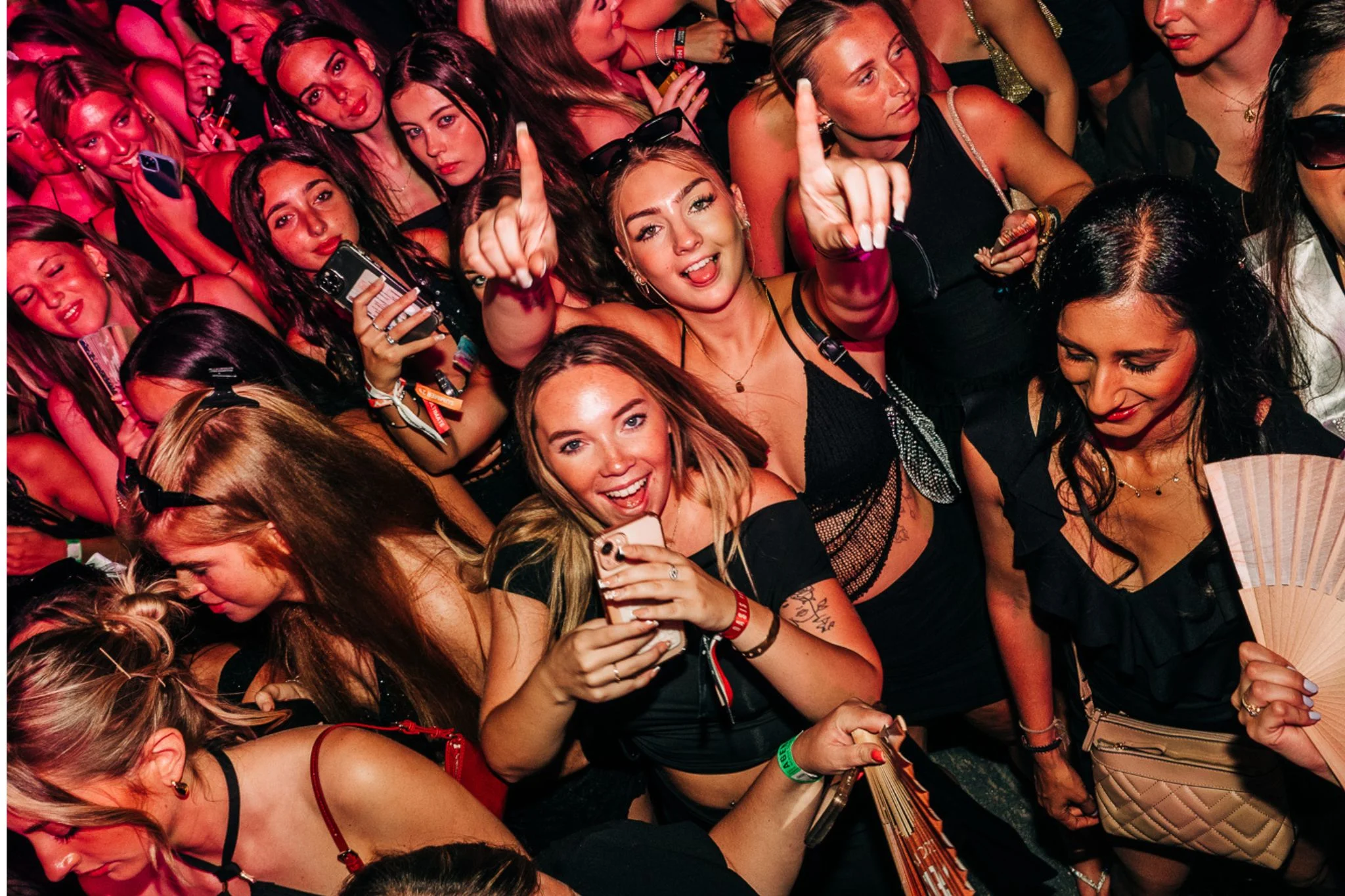 Group of girls dressed up and ready to party at Agenda Beach Club in Albufeira, bringing all the energy to the night.