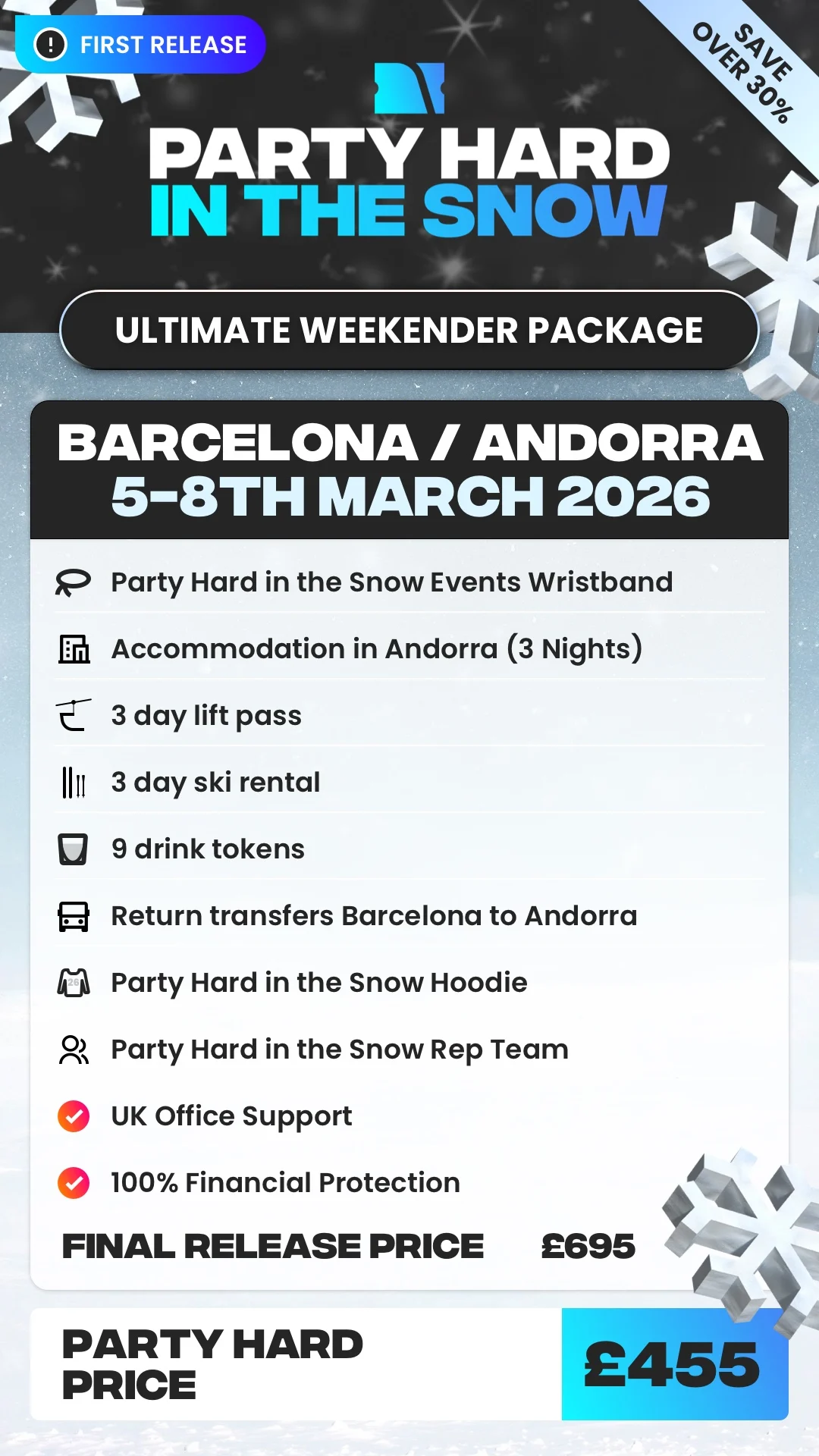 Your under-£300 weekender covers accommodation, ski access/beginner sessions, Party Hard Reps, après-ski events, and all the good vibes. You’ll just need to sort your travel to the resort and any food/drinks you buy while you’re there.